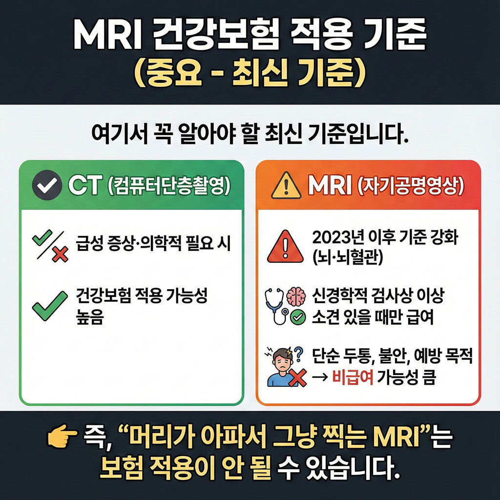 - 보험 적용은 MRI가 훨씬 까다롭다